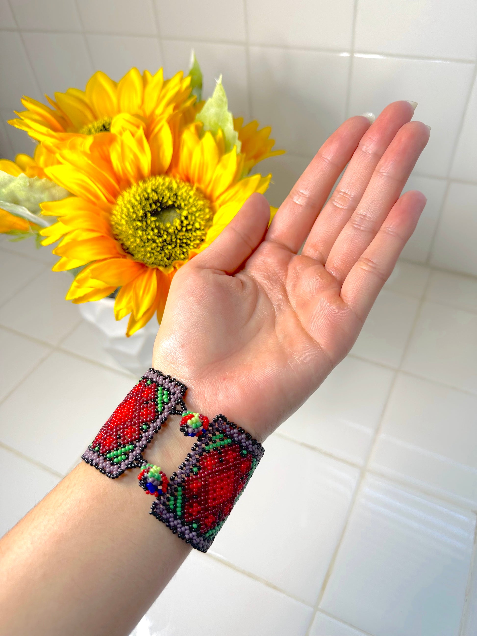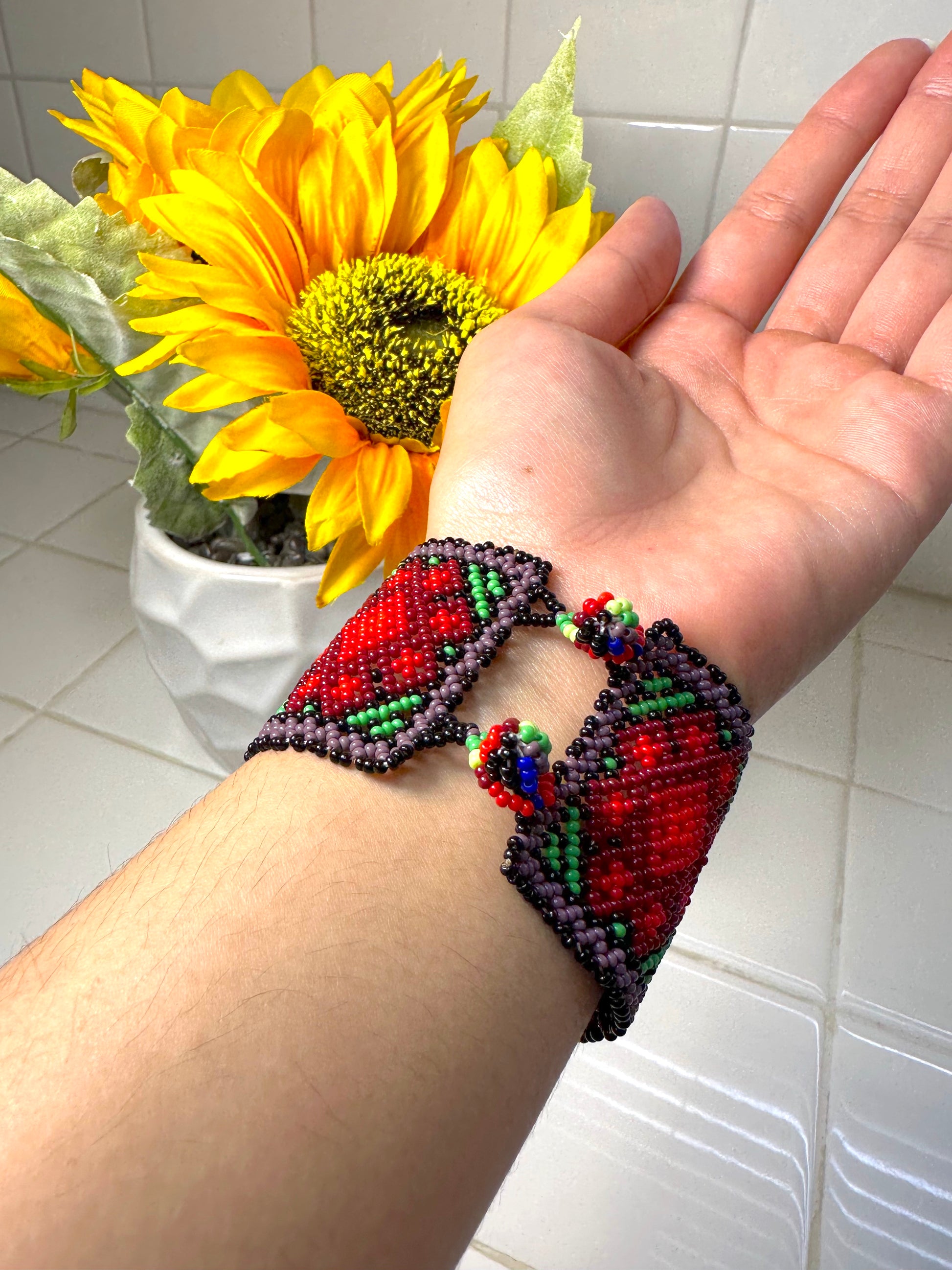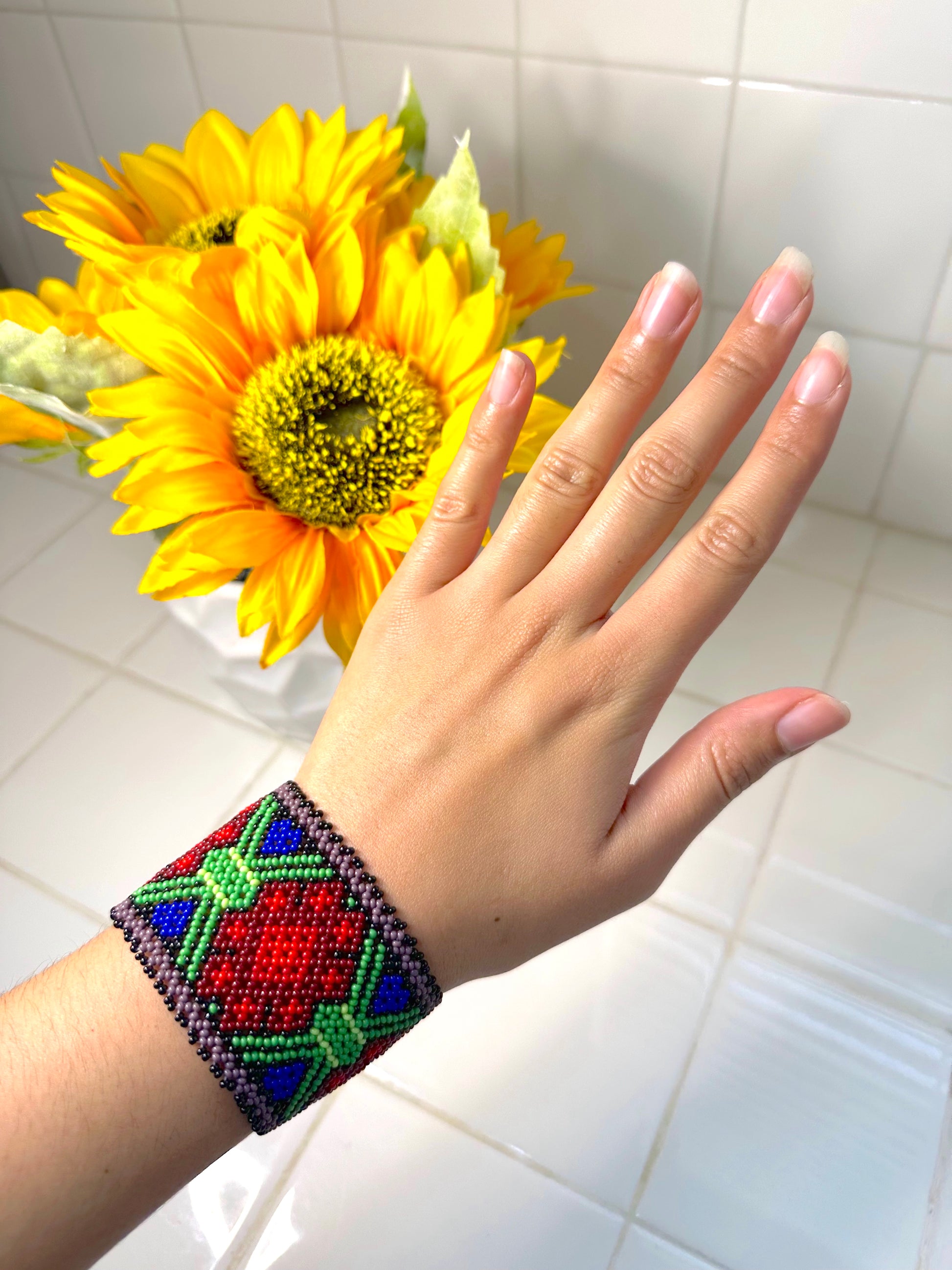 These are handmade Huichol bracelets from Zacatecas, MX. They are 7.5" X 2" in size. The clasp is beaded. I wear the same bracelets in my TikToks. 😉👍🏽