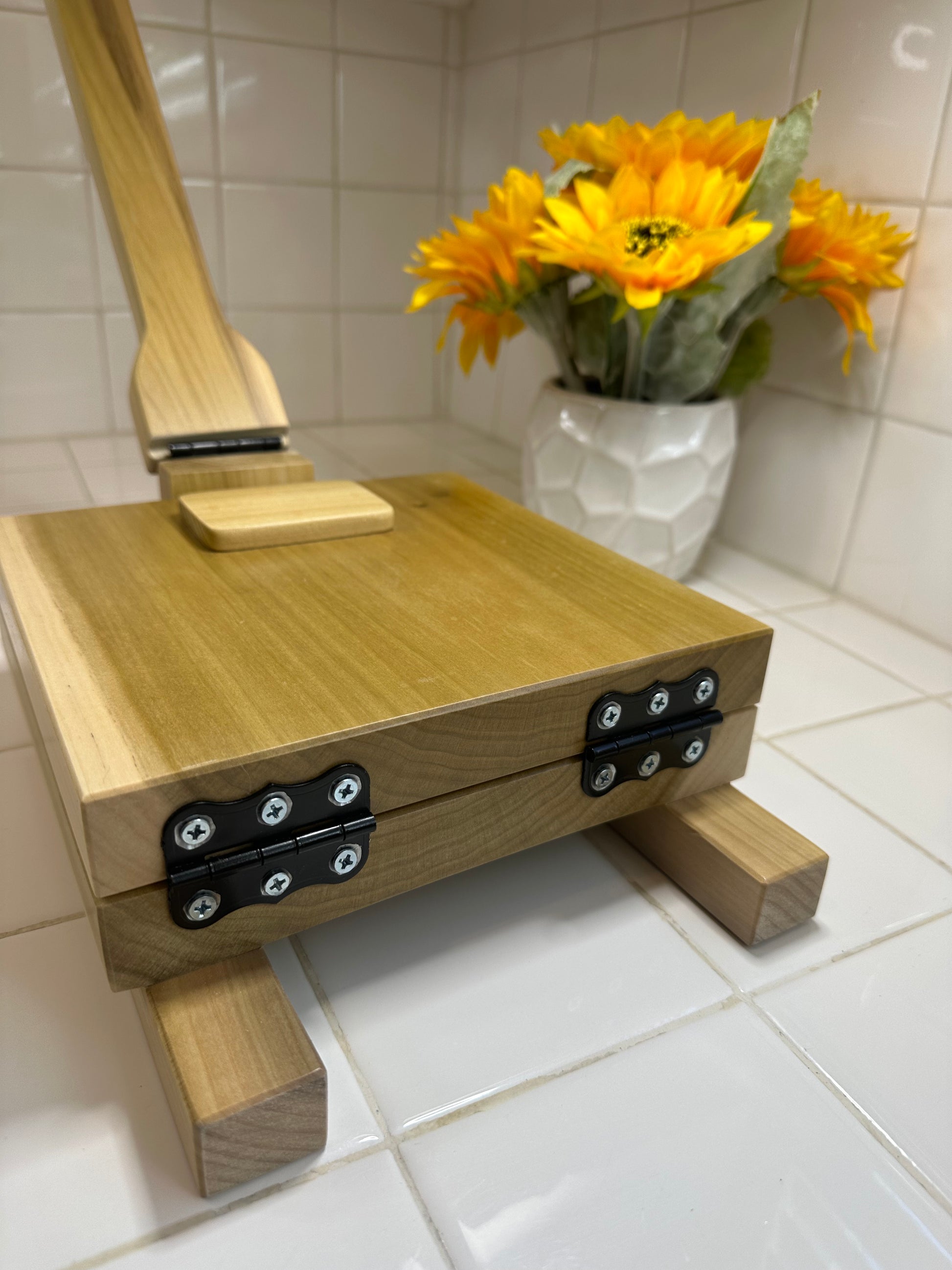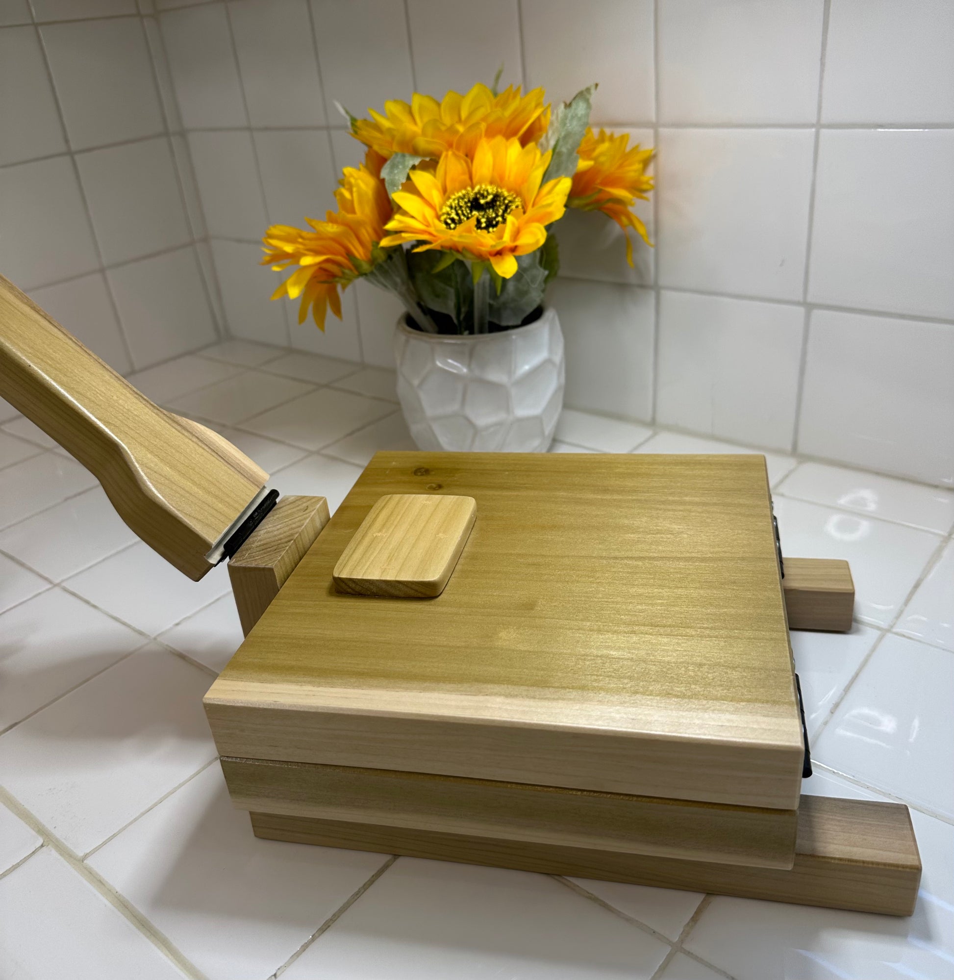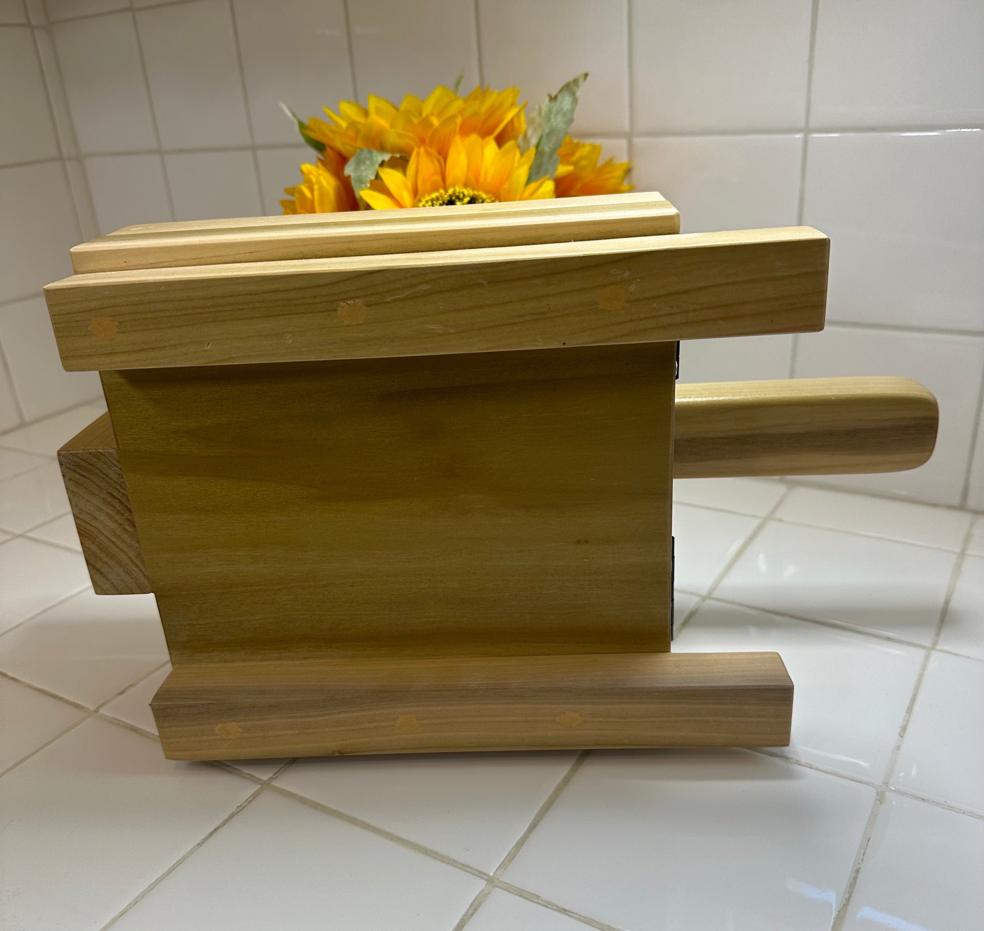The base is 8.25"X8.25" and the handle is 14". The material is poplar wood. My mom makes them as the orders come in.