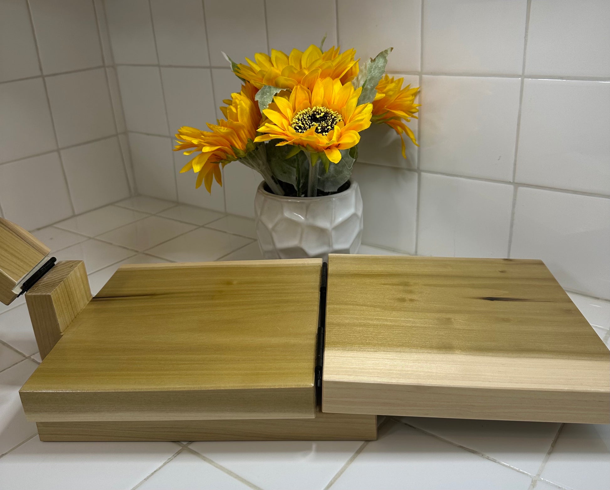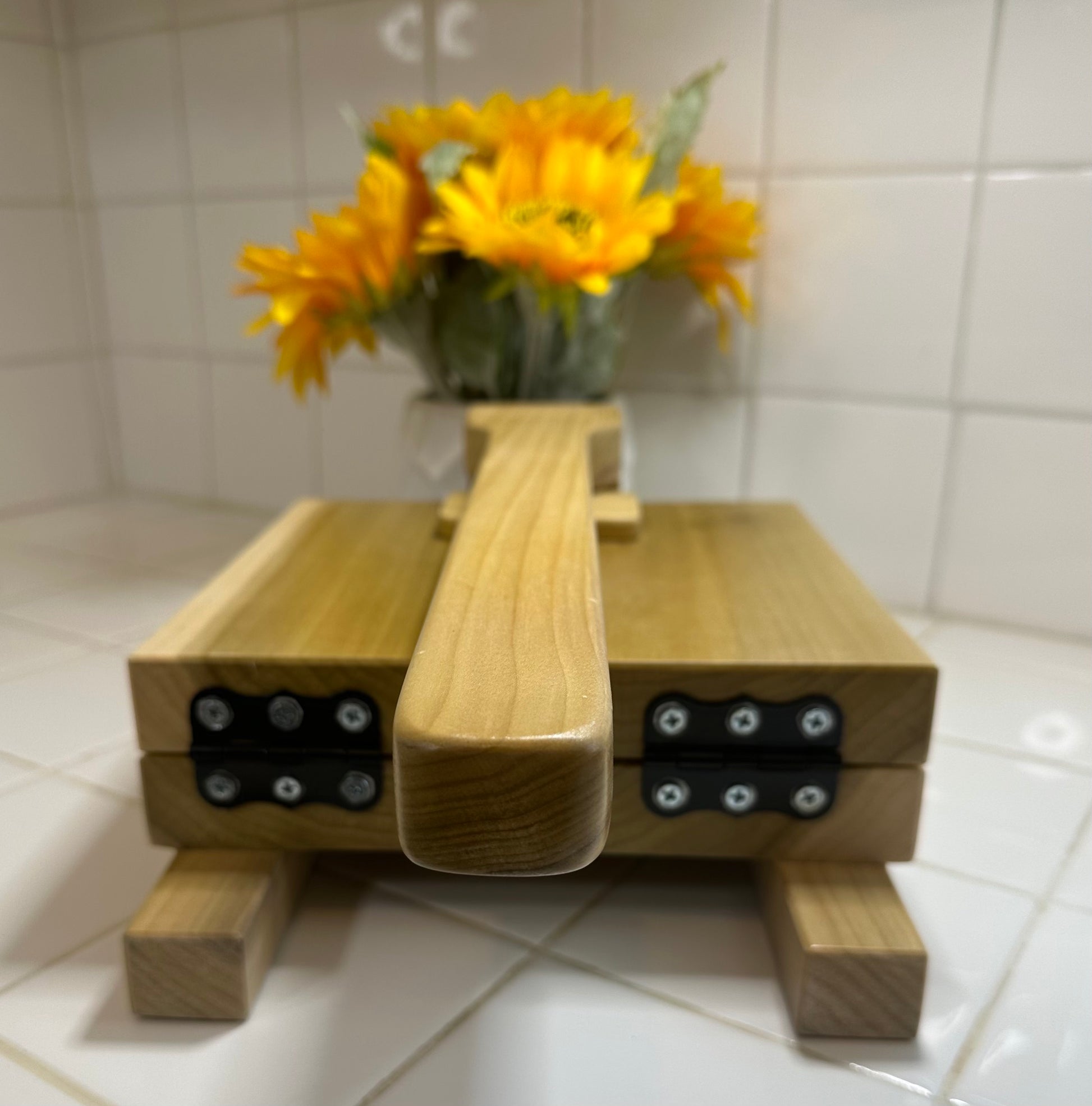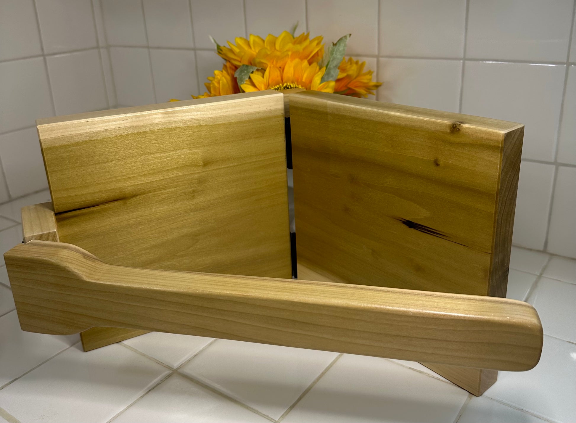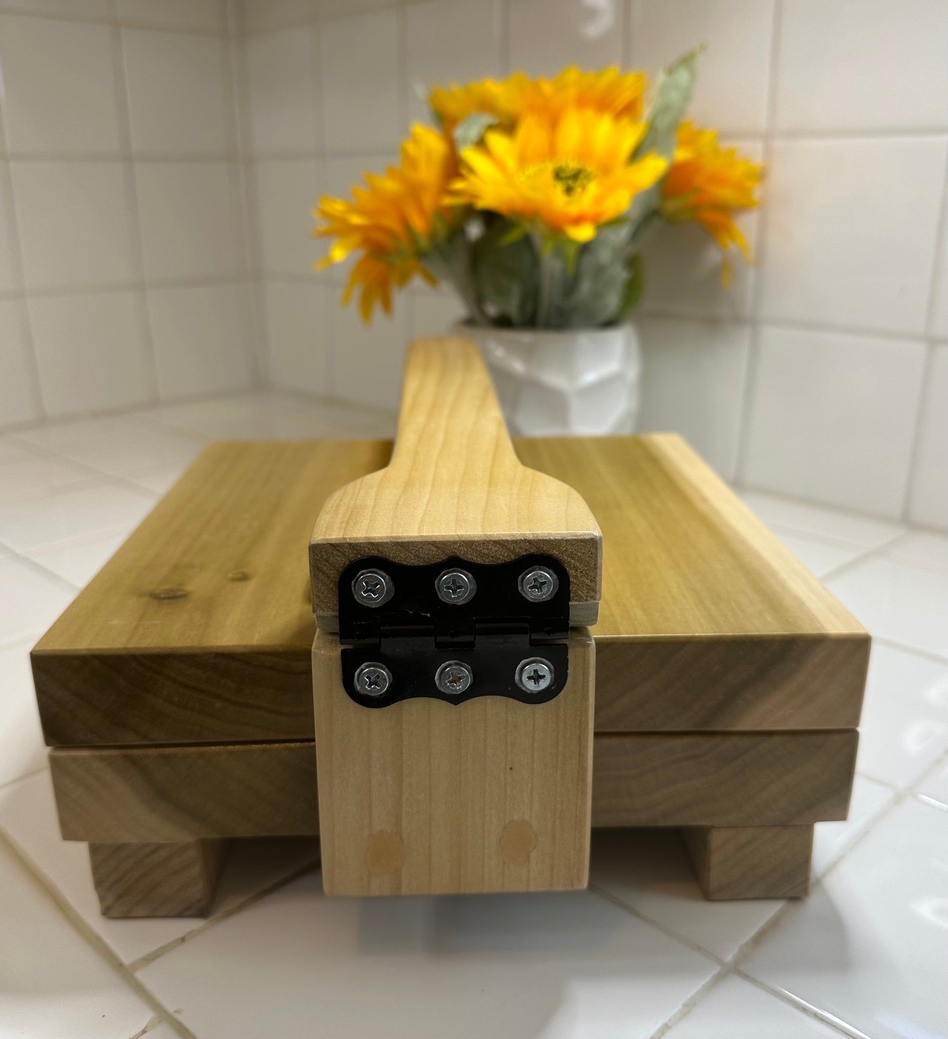 The base is 8.25"X8.25" and the handle is 14". The material is poplar wood. My mom makes them as the orders come in.